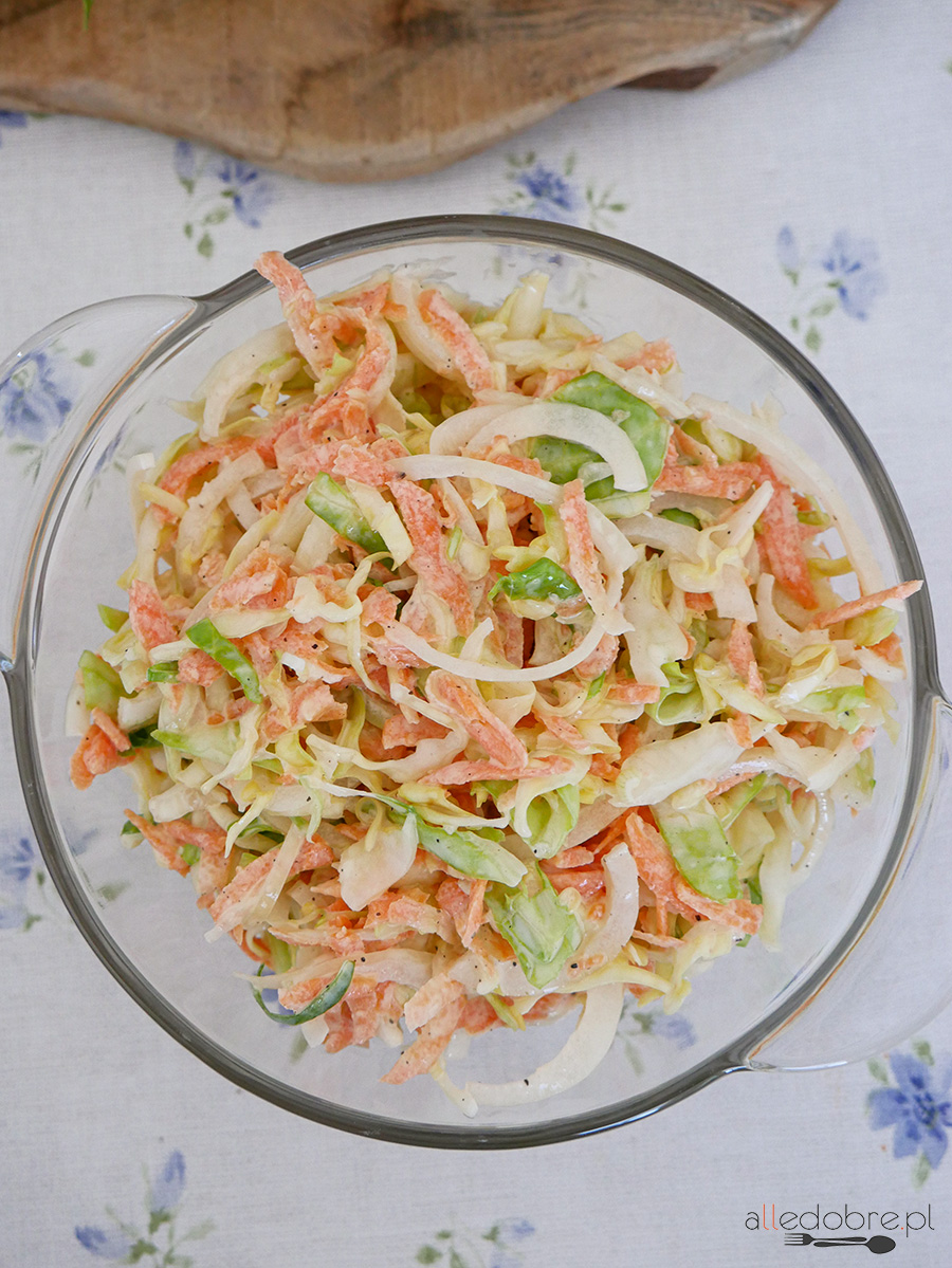 Surówka Colesław czyli pyszna surówka z kapusty z marchewką i majonezem. Można ją podawać samodzielnie, lub jako dodatek do obiadu, najlepiej do mięs i ryb, ale również do hamburgerów, czy do grilla. Jej sekret tkwi w prostocie – składa się z prostych składników, a jej przygotowanie zajmuje nie więcej niż 5