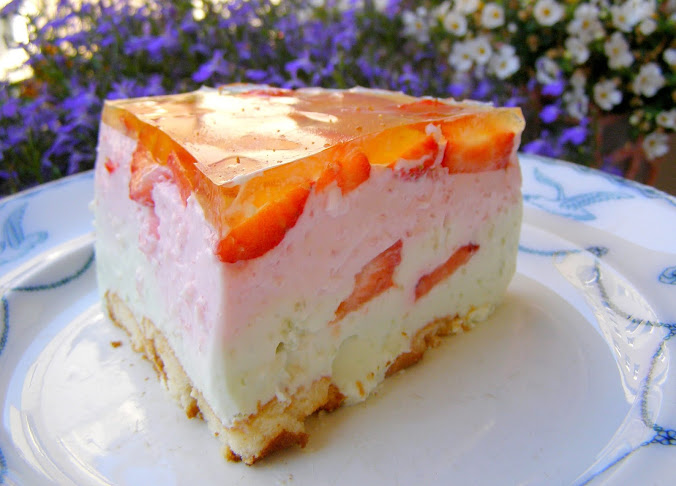 Składniki:biszkopty okrągłe 200 gram, truskawki 50 dag, galaretka agrestowa 1 opakowanie + 2 łyżeczki żelatyny deserowej + gorąca woda 300 ml, jogurt naturalny gęsty 380 gram, galaretka truskawkowa 1 opakowanie + 2 łyżeczki żelatyny deserowej + gorąca woda 300 ml, śmietana 18% 330 gram, galaretka cytrynowa 2 opakowania