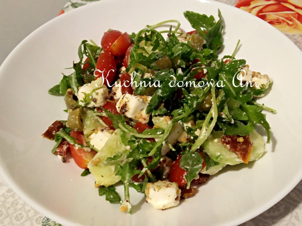 1/2 opakowania rukoli1 ser sałatkowy typu feta2-4 kabanosy z dodatkiem chillispora garść pomidorków koktajlowych2 ogórki gruntowe3 suszone pomidory w oliwiezielone oliwki