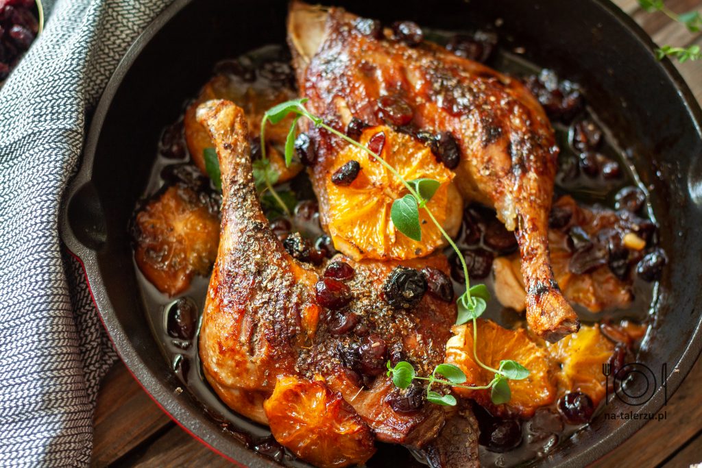 Pieczone udka kaczki z pomarańczami i żurawiną –