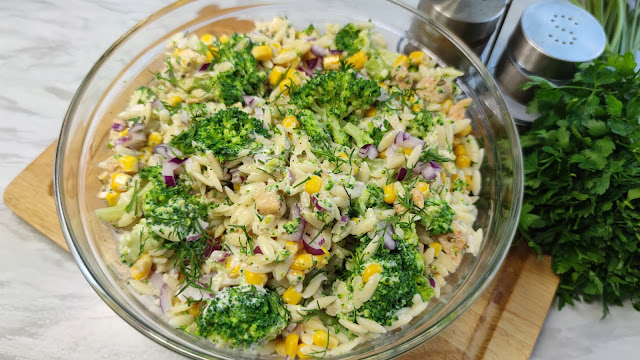 Brokuł 1 sztuka 500gFilet z kurczaka 1 sztukaCebula czerwona małaMakaron w kształcie ryżu 100 gKukurydza 1/2 puszkiKoperek siekany 2 łyżkiPrzyprawa do gyrosaMajonez 2 łyżkiŚmietana łyżkaSólPieprzPrzygotowanie:
