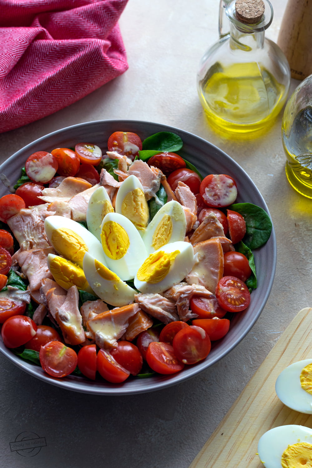 Szybka i pyszna sałatka na bazie świeżego szpinaku. Dla smaku i kolorystycznego akcentu mamy tutaj pyszne pomidorki koktajlowe. Sytości zapewnia zaś jajko oraz wędzony na gorąco łosoś.