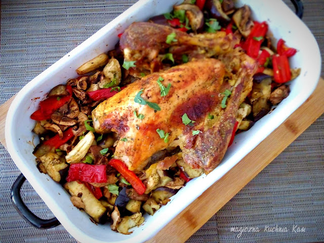 Składniki:1 perliczka (moja miała 1,3)1 duży bakłażan2 czerwone papryki2