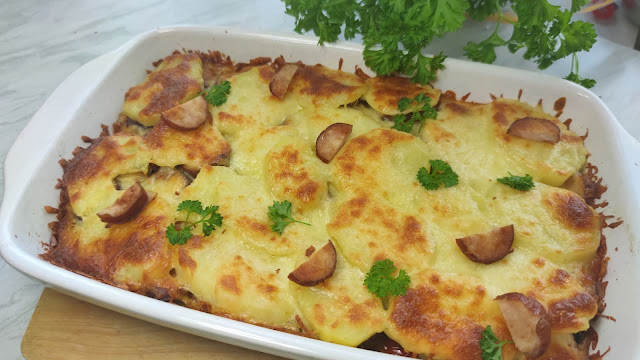 Kiełbasa (u mnie chuda z kurczaka) 400 g Ziemniaki 1 kgPieczarki 5 sztukPapryka czerwona 1/2Cebula średniaŚmietana 18 % 100 mljajkoSer 200-250 gOlej 2 łyżkiPrzygotowanie: