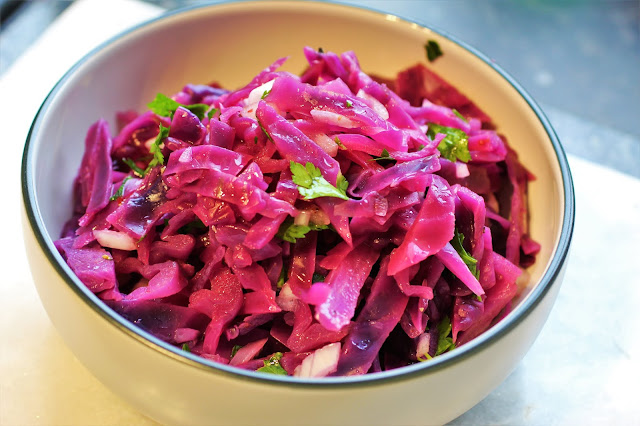 Sałatki tej nie uświadczycie na stołach w szkockich domach. Nie jestem też pewna czy ogólnie w brytyjskich domach przygotowuje się dania z udziałem czerwonej kapusty. Jedynym wyjątkiem są nowe, trendsetterkie, wersje tradycyjnej sałatki Coleslaw do przygotowania której, coraz częściej, za sprawą licznych