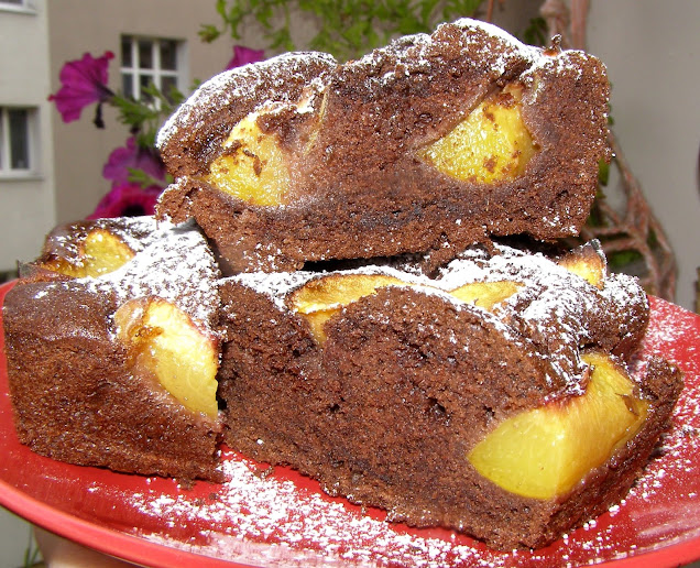 Składniki: kawa mielona 4 łyżeczki + wrząca woda 200ml, jajka 6 sztuk „M”, cukier 1 szklanka, palma 200 gram miękka, olejek pomarańczowy 1 łyżeczka, kakao 4 łyżki, mąka tortowa 2 szklanki, proszek do pieczenia 1 łyżeczka, brzoskwinie 8 sztuk, puder cukier – ile potrzeba