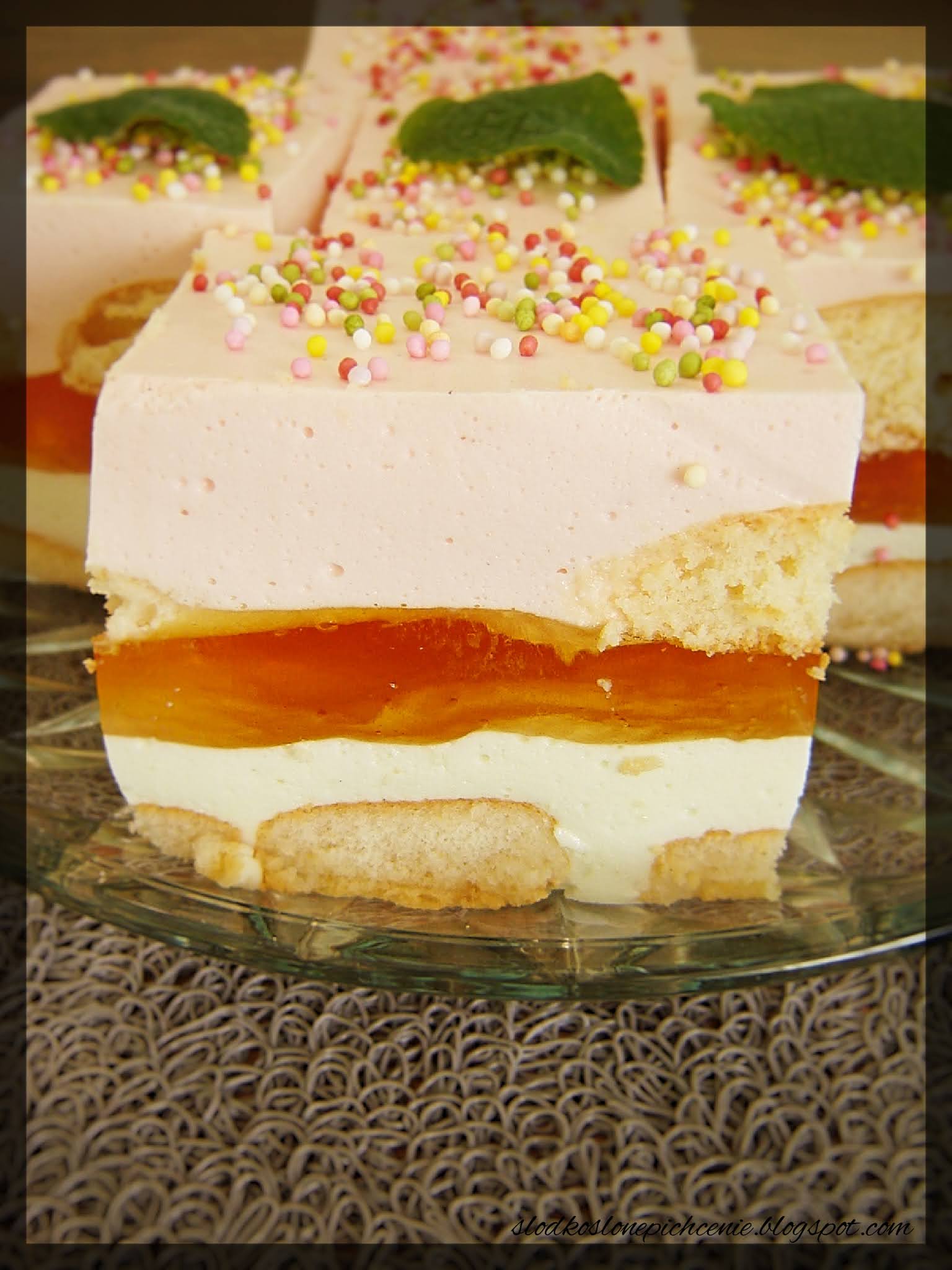 Pyszne, kolorowe ciasto bez pieczenia na biszkoptach, składające się z kilku kolorowych…