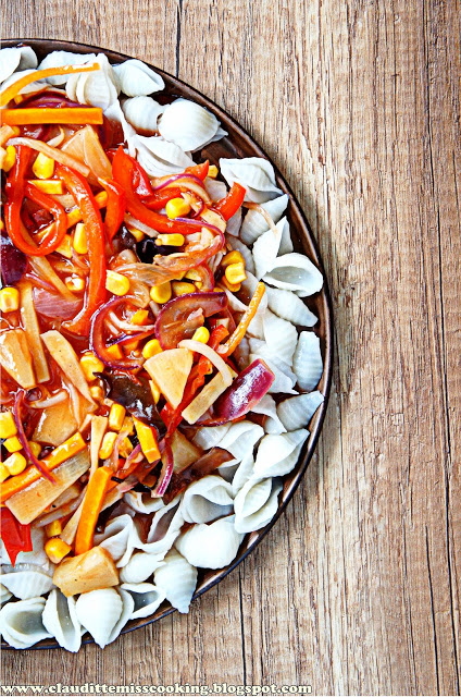 Ostatnio coraz częściej zajadamy się tego typu potrawkami. Nie są jakoś mocno pracochłonne, nie mamy tutaj dużo składników, które wymagają wcześniejszego przygotowania/pokrojenia. To co trzeba pokroić to mięso i pieczarki oraz tę niewielką ilość fasolki. Pieczarki kroję na pół lub na ćwiartki, co nie zajmuje dużo czasu, choć ja wykorzystuję