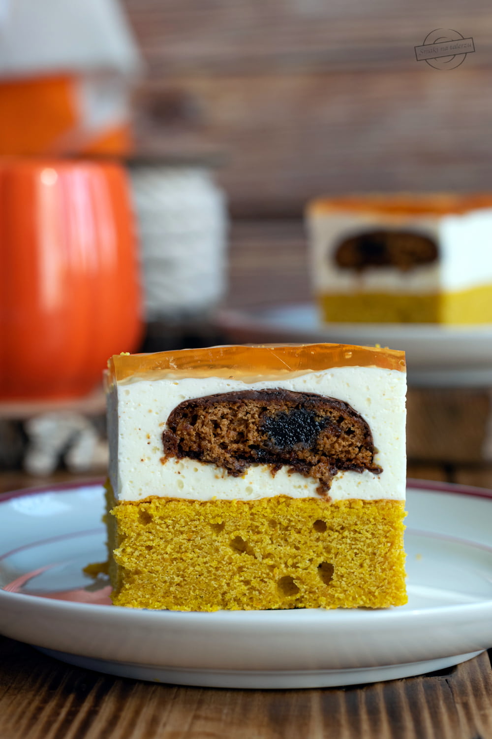 Kiedy zobaczyłam przepis na to ciasto, od razu zapragnęłam go wypróbować. Bardzo spodobał mi się pomysł na połączenie smaków. Ciasto dyniowe, masa z pierniczkami i galaretka.