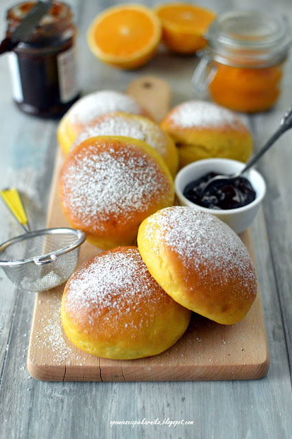 I oto kolejny przepis z wykorzystaniem dyniowego puree – rewelacyjne dyniowe bułeczki nadziane powidłami śliwkowymi. Przepyszne! Bułeczki są niesamowicie pulchne, mięciutkie, a przez dodatek cynamonu i skórki otartej z pomarańczy bardzo aromatyczne. No i mają taki piękny żółciutki kolor :). Nadzienie z powideł śliwkowych pasuje tutaj idealnie. Z