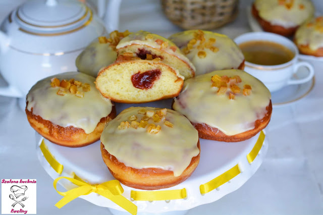 Klasyczne domowe pączki wypełnione dużą ilością domowej konfitury różanej, polane słodką białą…