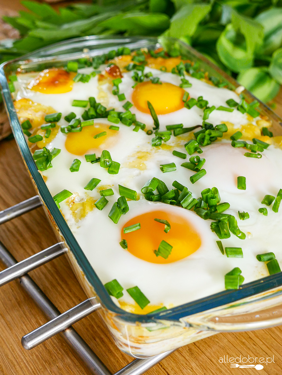 Zapiekanka oprócz jajek składa się także z ziemniaków, szynki, pieczarek i sera. Wszystkie te składniki idealnie ze sobą współgrają tworząc pyszną potrawę, która posmakuje każdemu. Do tego wygląda pięknie, a