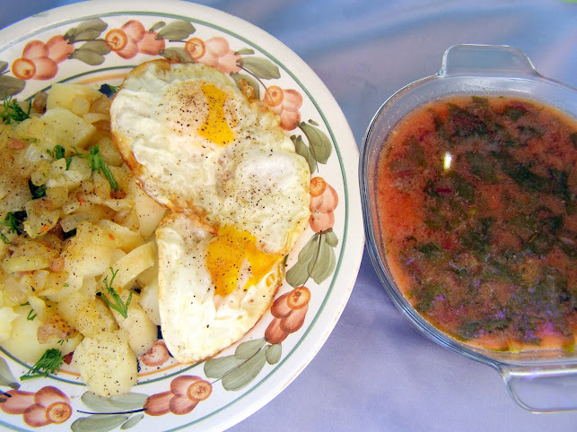 Składniki: botwinka 4 pęczki, rosół 2 litry, sól 1 łyżeczka, cukier 3 łyżki, pieprz mielony 1 łyżeczka, ocet jabłkowy 1-2 łyżki, mąka pszenna 3 łyżki, śmietana 18% 100 gram, mleko 3.2% 1 szklanka, ziemniaki ugotowane 1 kg, słonina wędzona 30- dag, cebula 1 sztuka duża, koperek 1/2 pęczka,