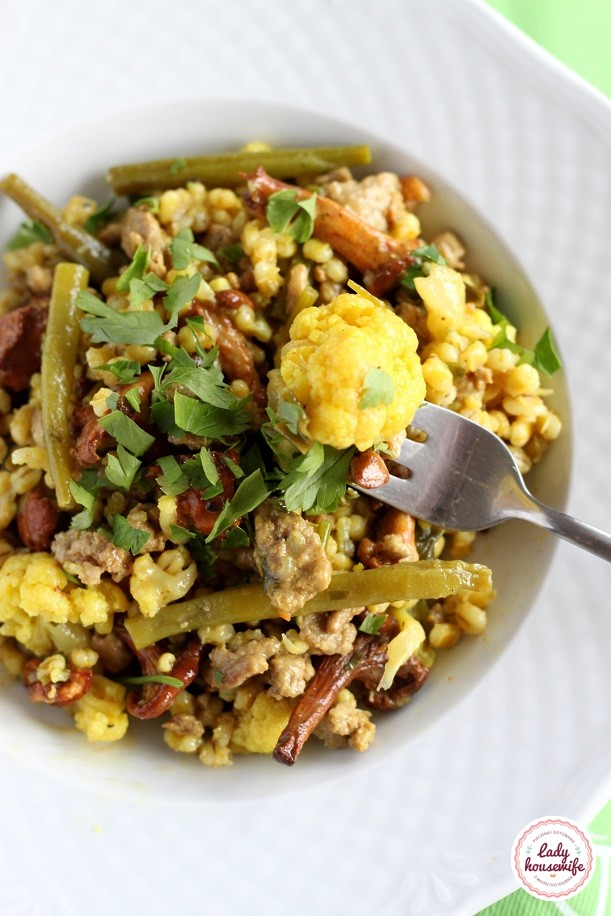 Kaszotto z indykiem, kalafiorem, kurkami i fasolką szparagową