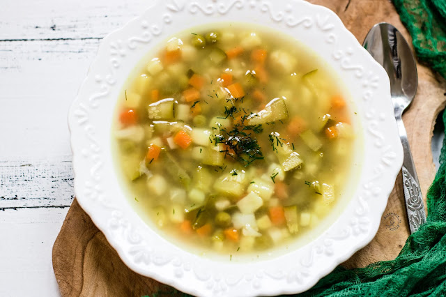 Składniki na 2 osoby:około 1,2 litra bulionu/wody1/2 słoika kiszonek cukinii pokrojonej w kostkętrochę wody z pod kiszonej cukiniimrożone warzywa (fasolka szparagowa, kalafior, brukselka, brokuł)2 średnie ziemniaki1 marchew1/2 korzenia pietruszkikawałek selera7 centymetrowy kawałek pora3 łyżeczki suszonej mieszanki warzywsól, pieprz2-3 łyżeczki posiekanego