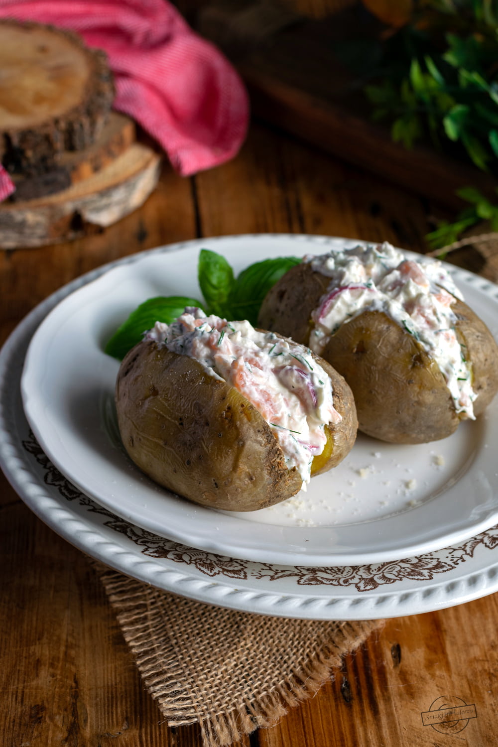 Prosty pomysł na obiad lub kolację na ciepło. Pieczone ziemniaki, wypełnione koperkowym twarożkiem z wędzonym łososiem i rzodkiewką. Niby prosto, a jak smacznie!