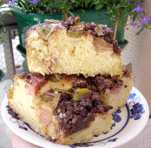 Składniki:drożdże świeże 5 dag, mleko 1,5 szklanki, cukier 1 szklanka, mąka tortowa 60 dag, jajka 3 sztuki „L”, sól 1 szczypta, olej rzepakowy 150 ml, rabarbar 5 sztuk większe