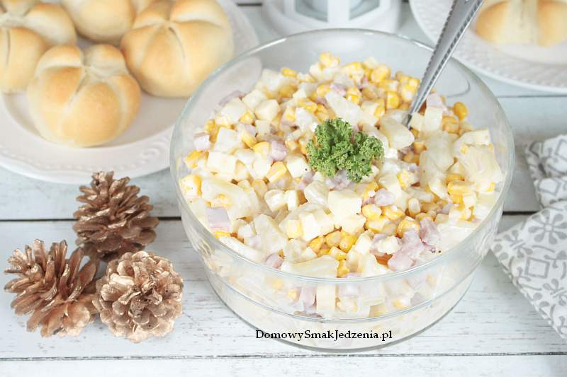 składniki:1 puszka ananasa150 g szynki200 g sera żółtego w kawałku1 puszka kukurydzy5…