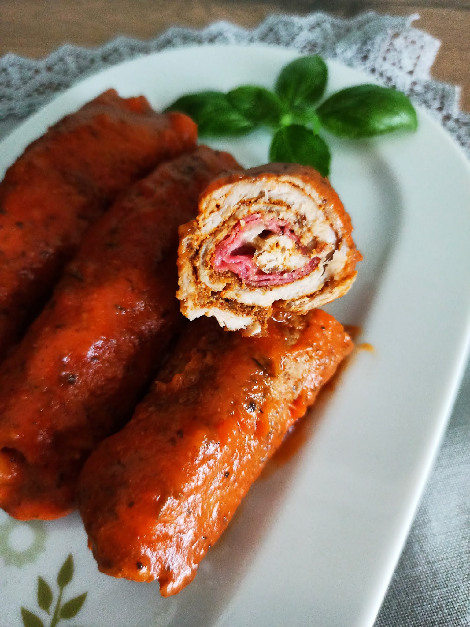 Pyszne roladki schabowe kryjące w swym wnętrzu salami i mozzarellę, duszone w aromatycznym sosie pomidorowym.