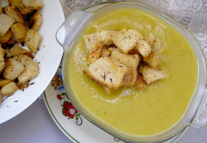 Składniki: włoszczyzna 1 pęczek, pory 4 sztuki średnie, ziemniaki 6 sztuk średnie, masło 2 łyżki, woda 2 litry, pieprz ziołowy 1 łyżeczka, papryka ostra 1 łyżeczka, kucharek 2 łyżki, bułka paryska 1 sztuka, olej rzepakowy 3/4 szklanki, tymianek 2 łyżki, pieprz mielony 1 łyżeczka