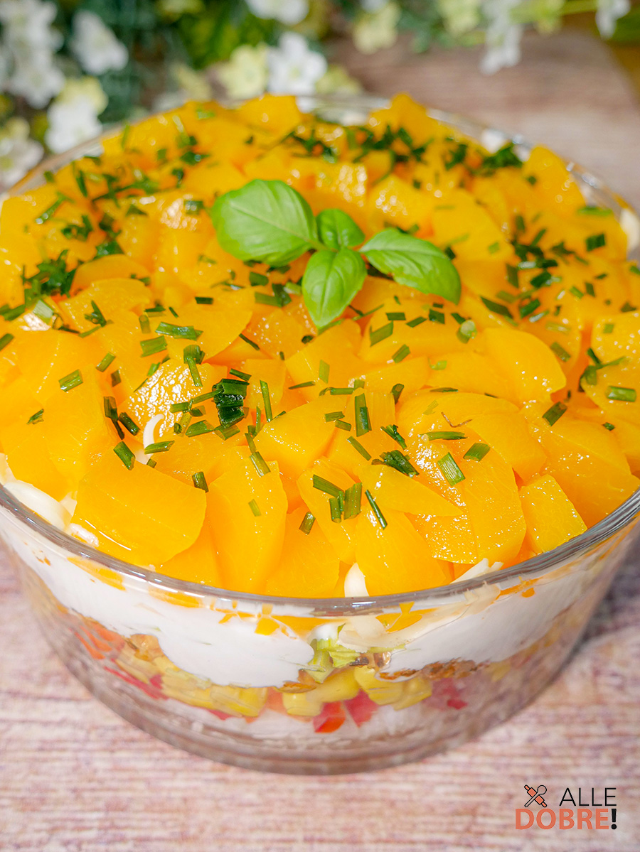 Sałatka brzoskwiniowa polana to sałatka warstwowa idealna na specjalne okazje. Smakuje wyśmienicie…