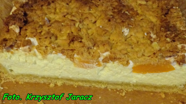 Kruchy sernik z brzoskwiniami i pianką bezową.