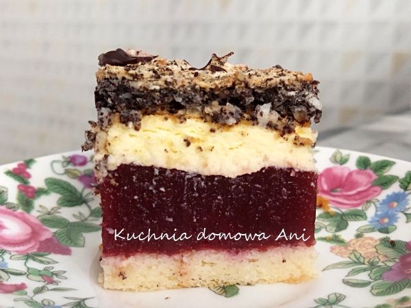 To jedno z pyszniejszych ciast jakie piekłam ostatnio. Połączenie smaków jest bardzo udane. Od siebie dodałam wiśnie do warstwy z dżemem porzeczkowym i galaretką. Polecam serdecznie.