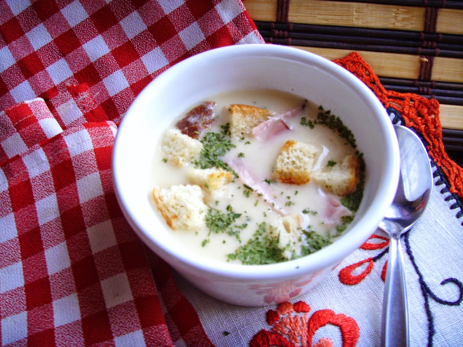 Zupa krem cebulowo-serowa z grzankami i bekonem.