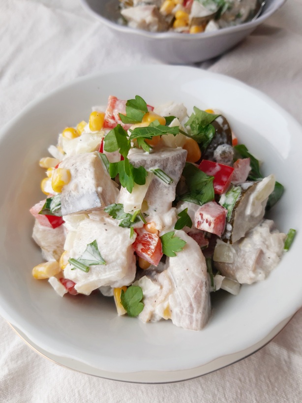Pyszna i pożywna sałatka śledziowa z kukurydzą, papryką i kiszonymi ogórkami w…