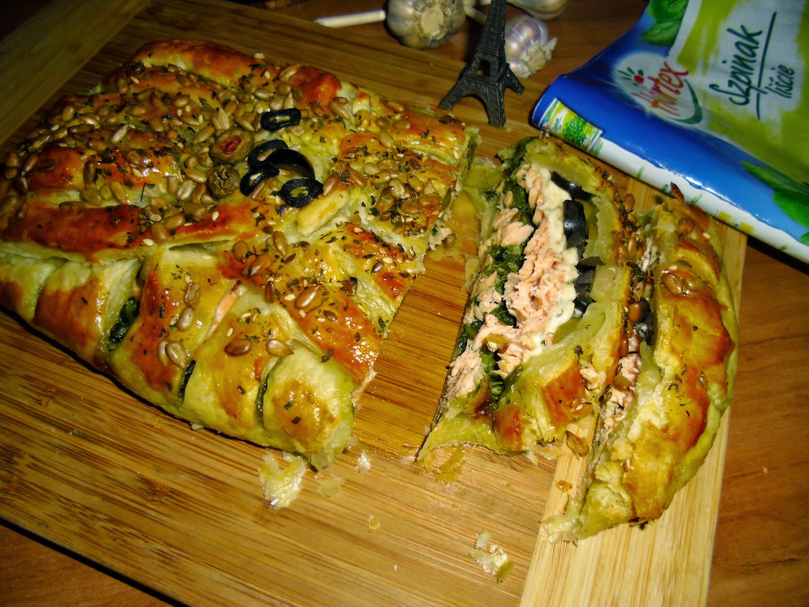 Salmon en Croute – Łosoś ze szpinakiem, serem pleśniowym, oliwkami i ziołami w cieście. Bezglutenowy.
