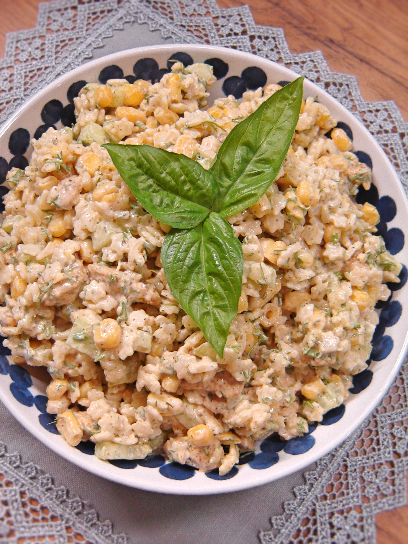 Prosta, wyśmienita, składająca się zaledwie z kilku składników sałatka makaronowa z kurczakiem, kukurydzą, ogórkiem i sosem koperkowo-ziołowym.