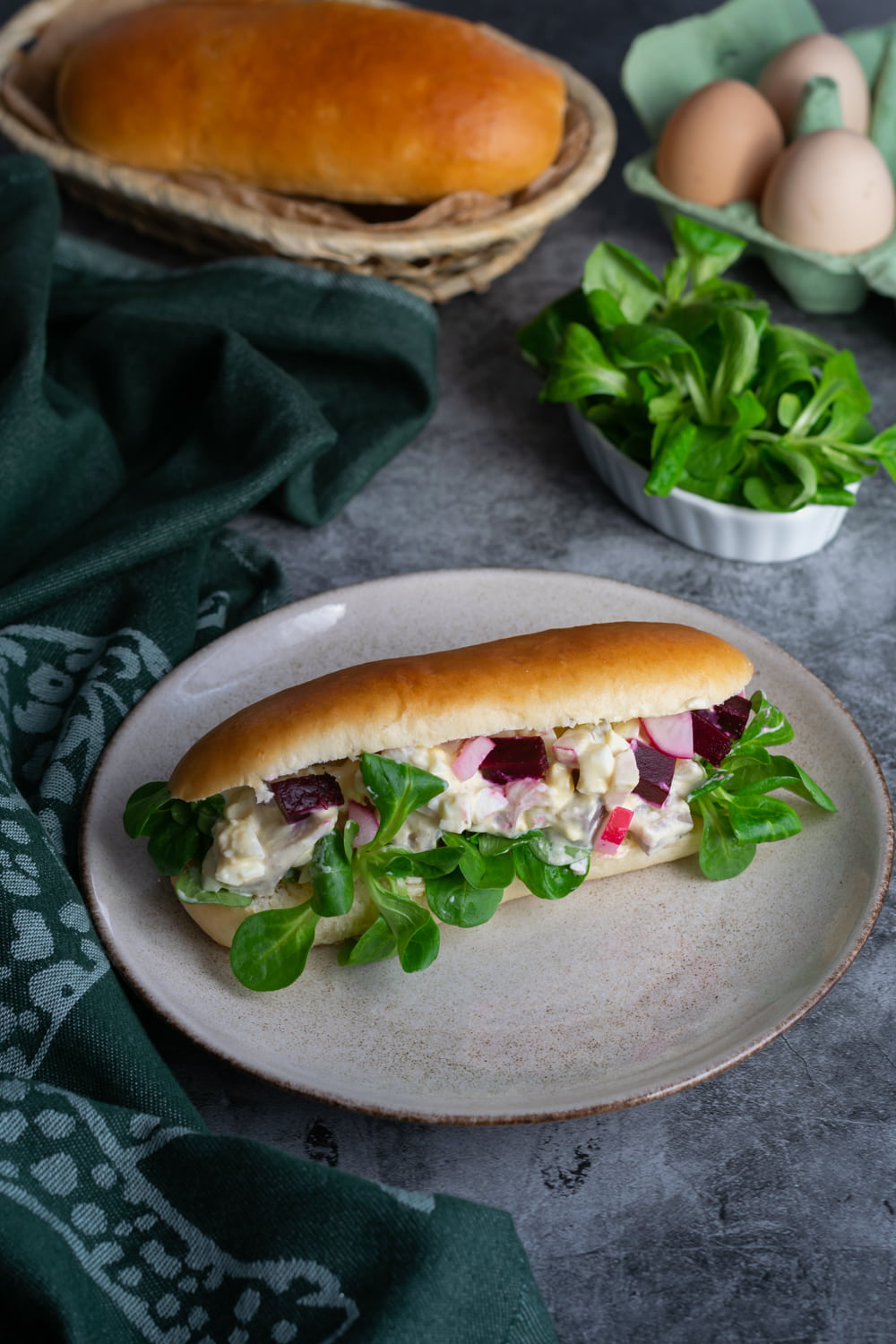 Moja ulubiona pasta jajeczno-śledziowa zamiast, jak zwykle, na kanapki, powędrowała tym razem do słodkich bułek. Dodałam jeszcze trochę świeżej rukoli, rzodkiewki oraz kawałek małego buraka.