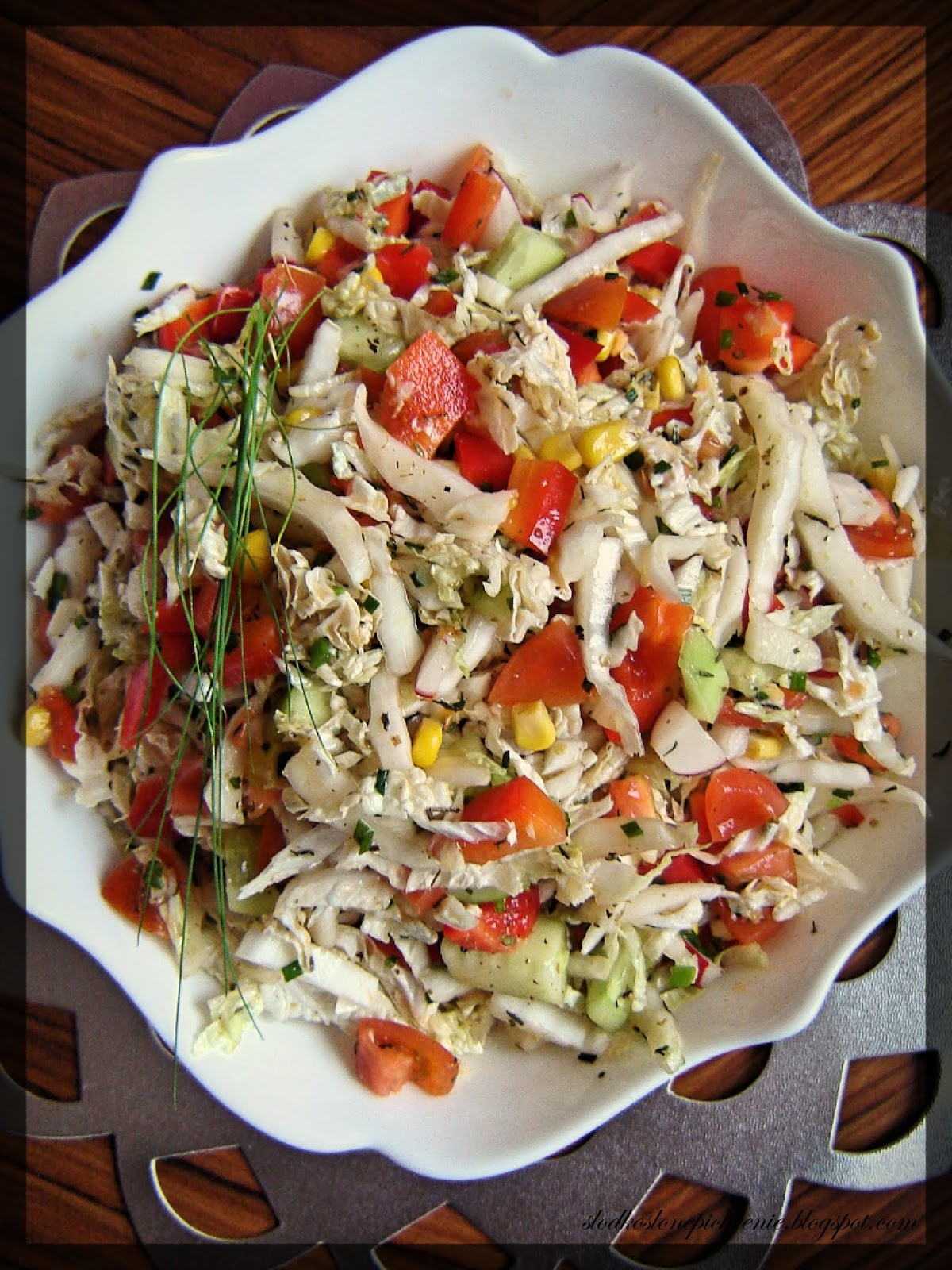 Pyszna, wiosenna surówka z kapusty pekińskiej z dodatkiem pomidora, papryki, ogórka, rzodkiewki…