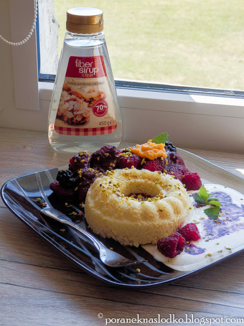 Waniliowa babeczka jaglana podana z kokosowym jogurtem, malinami, sosem jeżynowym, pistacjami, puree…