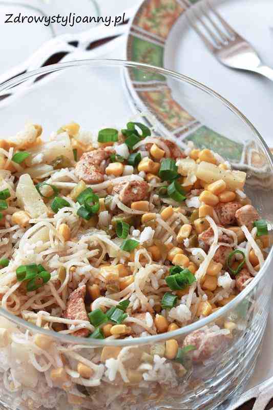 Sałatka z selera konserwowego i ananasa. Ta sałatka to zdrowy posiłek. Delikatny, soczysty kurczak z ananasem, z dodatkiem ryżu, selera oraz ogórka