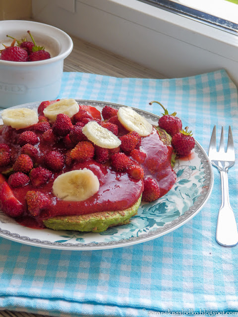 Bananowe pancakes z bobu i mąki z kassawy podane z poziomkowym musem,…