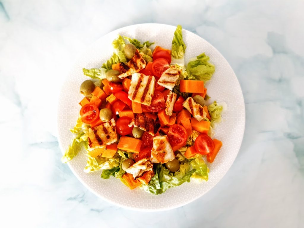 Sałatka z pieczonym serem halloumi i batatem to bardzo sycący i wartościowy posiłek. Z powodzeniem można go potraktować jako obiad i właśnie w takiej wersji zjadłam ją ostatnio. Uwielbiam bataty i ten rodzaj cypryjskiego sera półtwardego z mieszanki mleka owczego, koziego i krowiego. Od samego początku wiedziałam, że to połączenie