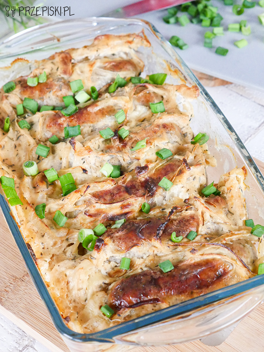 Zapiekana biała kiełbasa w sosie chrzanowym to doskonałe danie, które sprawdzi się zarówno w okresie świątecznym jak i w przypadku zwykłego obiadu. Potrawa jest niezwykle aromatyczna i bogata w smaku. A do tego bardzo prosta w przygotowaniu.