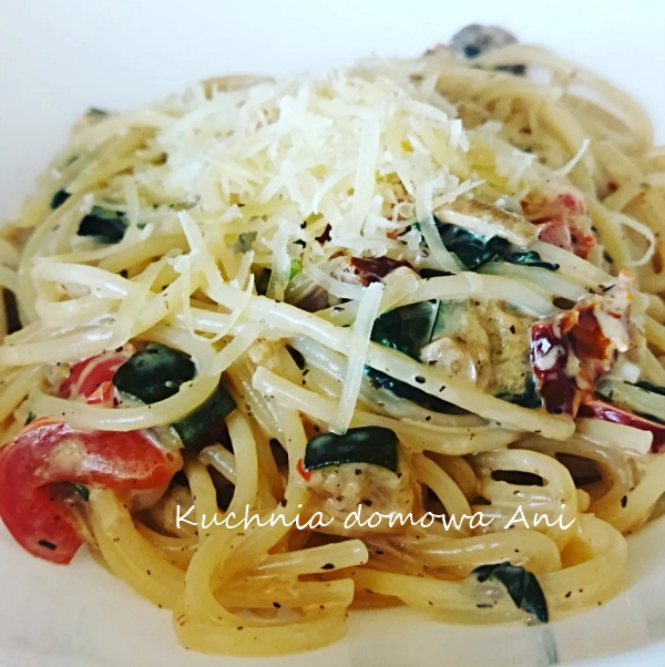 makaron spaghetti ugotowany dla dwóch-trzech osób1/2 niedużej czerwonej paprykikilka pieczarek1/2 cebulikawałek cukinii3-4 pomidorki suszone w oleju1/2 paczki świeżego szpinaku2-3