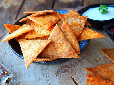 Domowe nachosy z gotowych placków tortilli o smaku słodkiej chili, pieczone w…