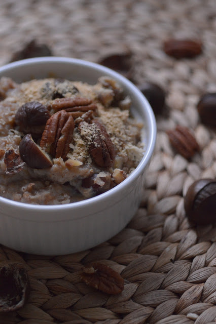 płatki gryczane z bananem, daktylami, kasztanami, pecanami i płatkami drożdżowymi v jedyne,…