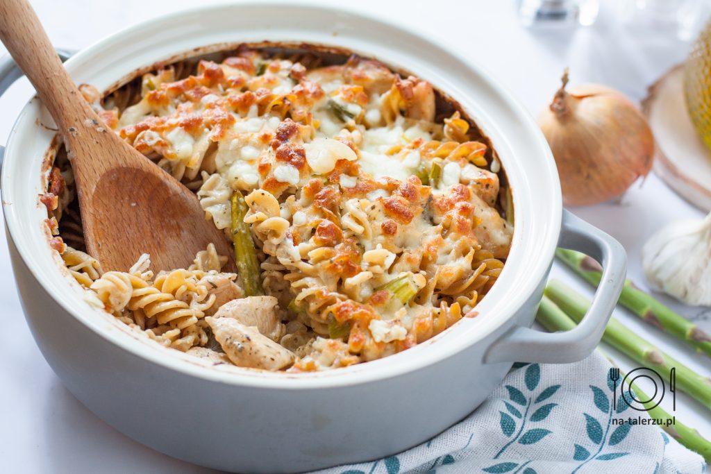 Zapiekanka makaronowa z kurczakiem i szparagami to pyszny pomysł na obiad sezonowy.…
