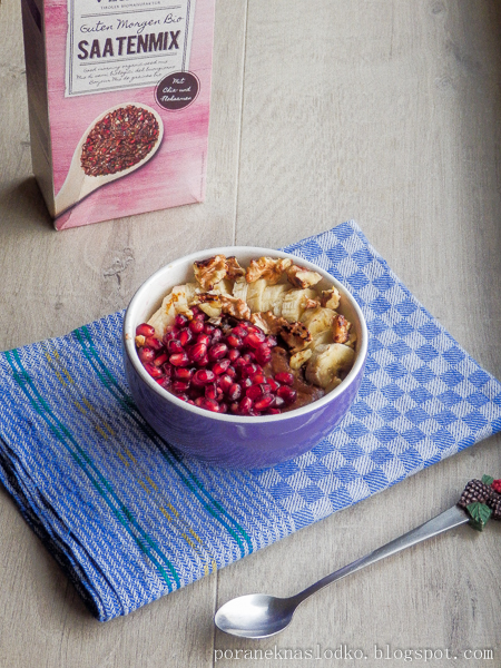 Podwójnie* czekoladowa owsianka z mieszanką ziaren z malinami Verival, bananem, prażonymi orzechami…