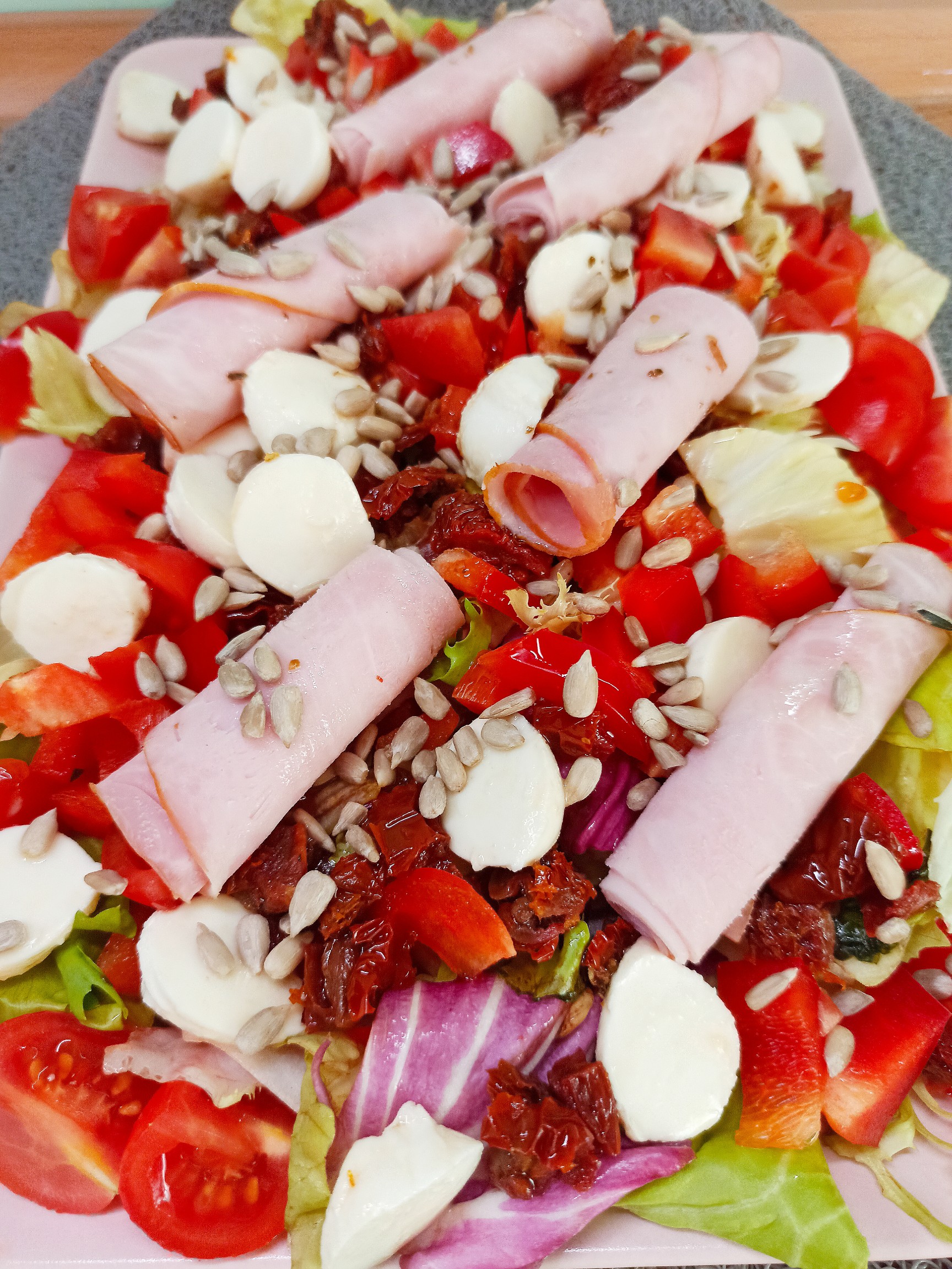 Zdrowa i smaczna sałatka z mozzarellą, szynką, pomidorkami koktajlowymi, papryką i suszonymi pomidorami.