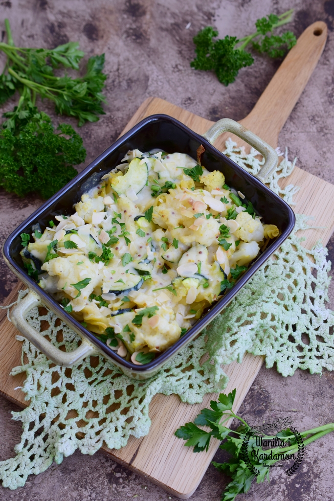 Dziś propozycja na bezmięsną zapiekankę. Makaron zawsze się sprawdza w awaryjnych sytuacjach i wcale nie trzeba mięsa aby najeść się do syta. Zwykle najprostsze chwyty najlepiej się sprawdzają a kalafior z makaronem i cukinią zapieczony pod kołderką kremowego sosu smakuje wręcz wybornie. Tę zapiekankę można podać o