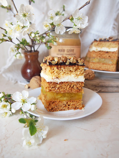 Miodowniki to ciasta, które kojarzą się ze świętami, ja jednak tak bardzo je lubię, że piekę je częściej. Uwielbiam gdy po domu roznosi przyjemny aromat miodowego ciasta. Tym razem dla przełamania smaku dodałam jabłka w galaretce, których kwasowość idealnie przełamuje