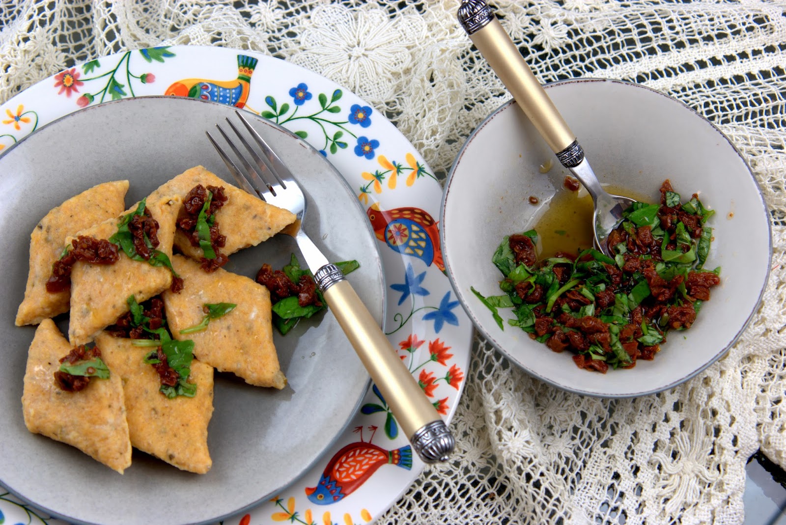 Leniwe jaglane z kozim (lub krowim) twarogiem i aromatycznym sosem z suszonych…