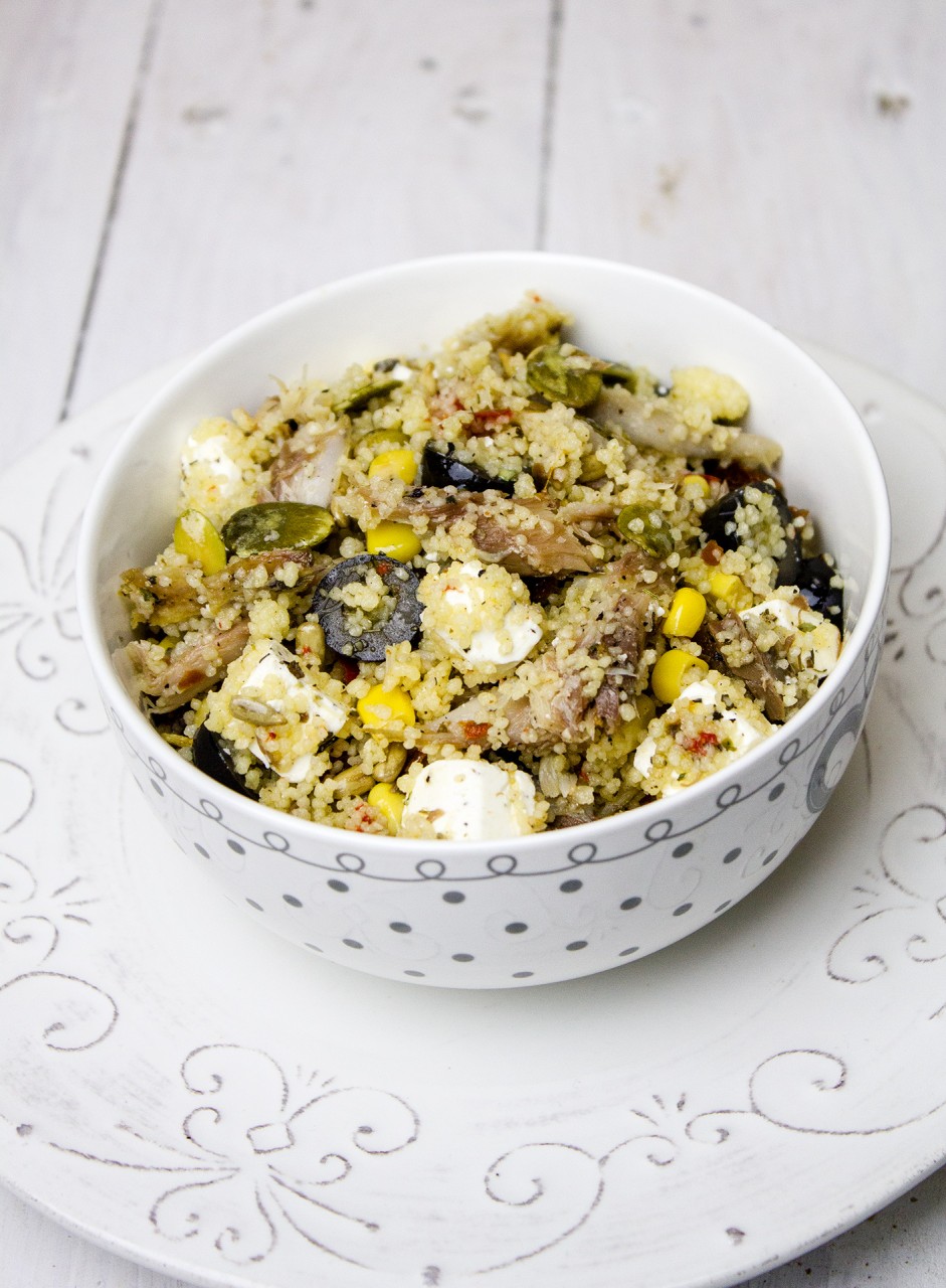 Wpis pochodzi z www.mgotuje.pl Sałatka z kaszą kuskus, wędzoną makrelą, oliwkami, suszonymi…