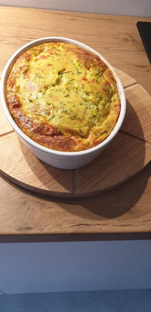 1 papryka czerwona (podzieliłam na 4 częsci i wrzuciłam do piekarnika na 15 min na 180C aż skórka ściemniała)4 średnie ziemniaki ugotowane1 mała cukinia5 jajek180 gram żółtego sera135 dag