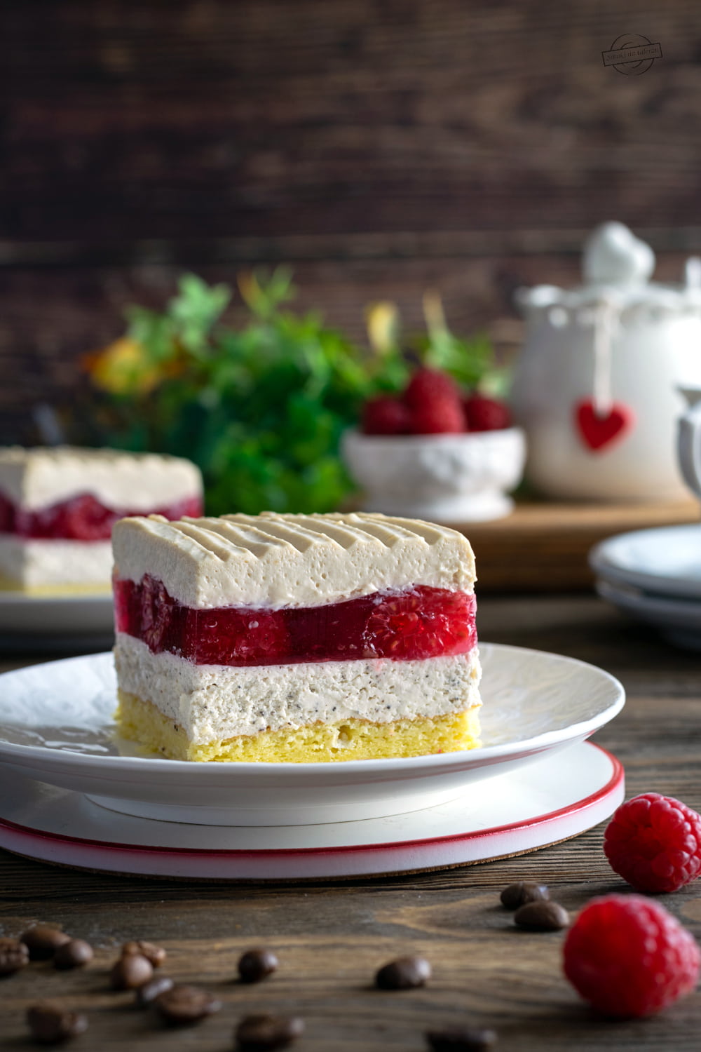 Kawa + maliny? O tak, to zdecydowanie bardzo udane połączenie. Jeżeli lubicie ciasta o wspaniałym aromacie kawy, koniecznie przygotujcie sobie ten biszkopt z masą kawową i malinami. Warstwę malin w galaretce, oddzielają tak naprawdę dwie masy kawowe. Choć obie przygotowane są na bazie mascarpone i śmietanki, delikatnie różnią się między